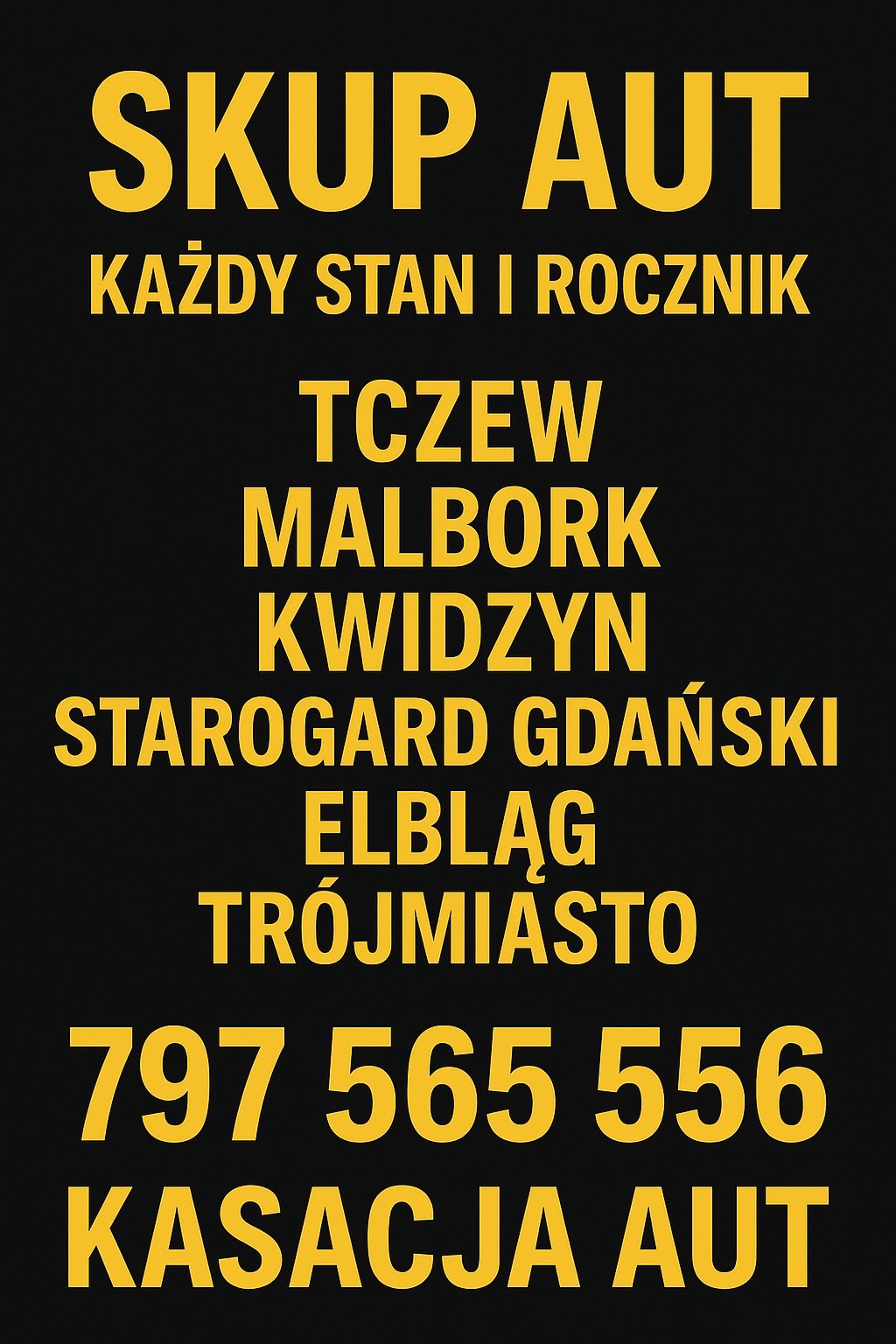 Skup Aut i Kasacja Pojazdów – Pomoc Drogowa Oferujemy szybki i bezproblemowy skup samochodów wszystkich marek, także uszkodzonych i powypadkowych. Zajmujemy się profesjonalną kasacją aut zgodnie z obowiązującymi przepisami oraz zapewniamy całodobową pomoc drogową. Gwarantujemy uczciwe ceny, szybki dojazd i minimum formalności. Działamy na terenie całego Tczew Malbork Pelplin Gniew Pszczółki Sztum